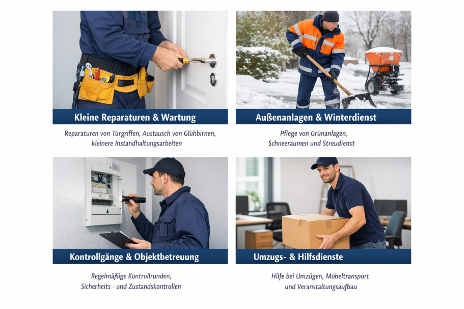 Zu unseren Aufgaben gehören unter anderem kleinere Reparaturen, der Austausch von Leuchtmitteln, die Kontrolle von Türen, Fenstern und technischen Einrichtungen sowie allgemeine Wartungsarbeiten.