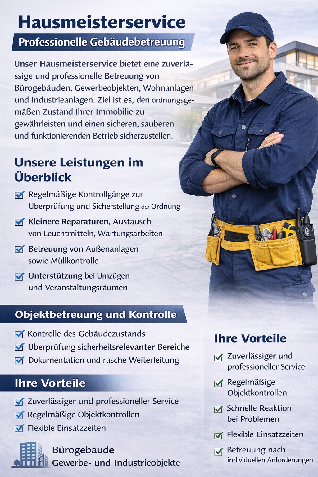 Unser Hausmeisterservice bietet eine zuverlässige und professionelle Betreuung von Bürogebäuden, Gewerbeobjekten, Wohnanlagen und Industrieanlagen. Ziel ist es, den ordnungsgemäßen Zustand Ihrer Immobilie zu gewährleisten und einen sicheren, sauberen und funktionierenden Betrieb sicherzustellen.