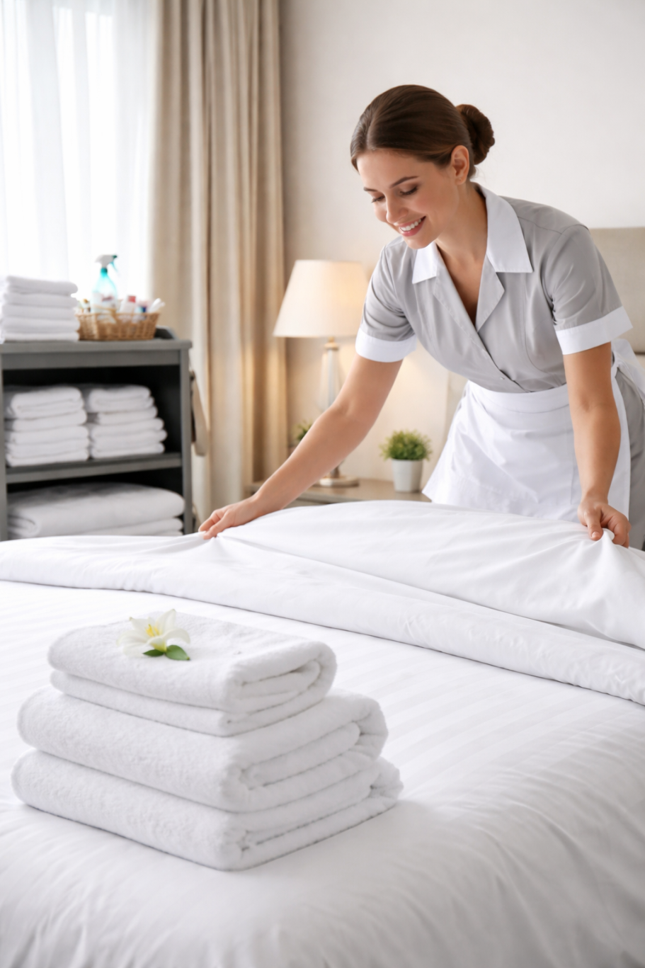 Reinigung und Pflege von Hotelzimmern, Badezimmern und öffentlichen Bereichen gemäß festgelegten Hygienestandards.
